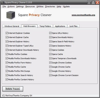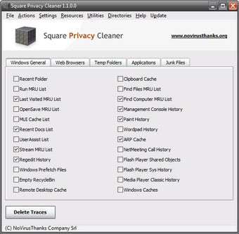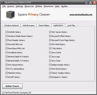 Darmowy Square Privacy Cleaner Portable przyda się, aby zatrzeć ślady pozostawione w kafejce internetowej lub komputerze w pracy. Gruntowne czyszczenie jest przeprowadzane w wybranych komponentach systemu operacyjnego i nie zajmuje dużo czasu. Program nie wymaga instalacji.